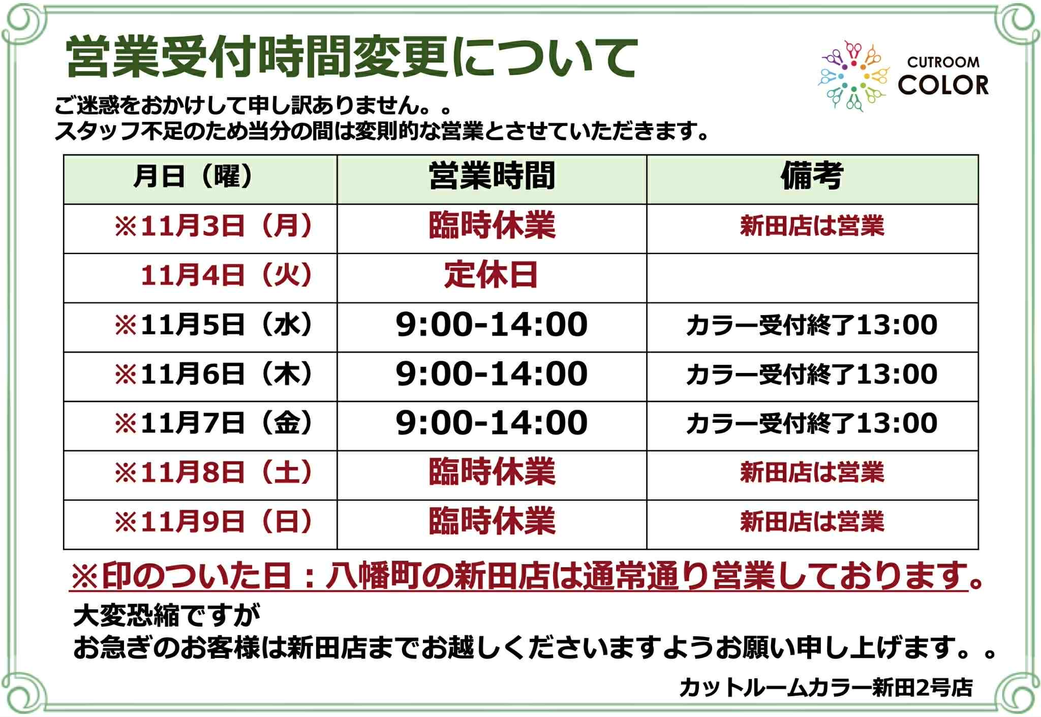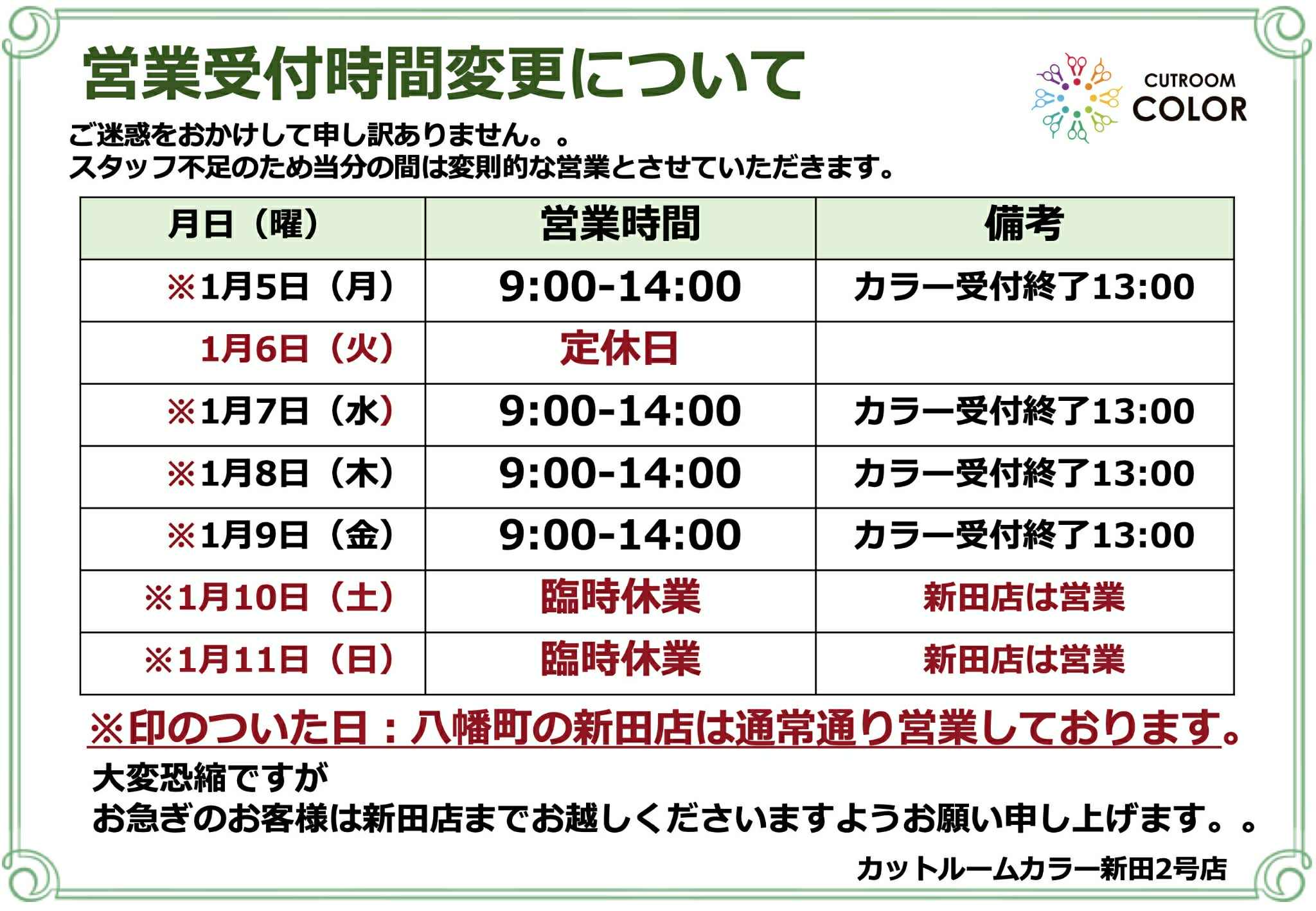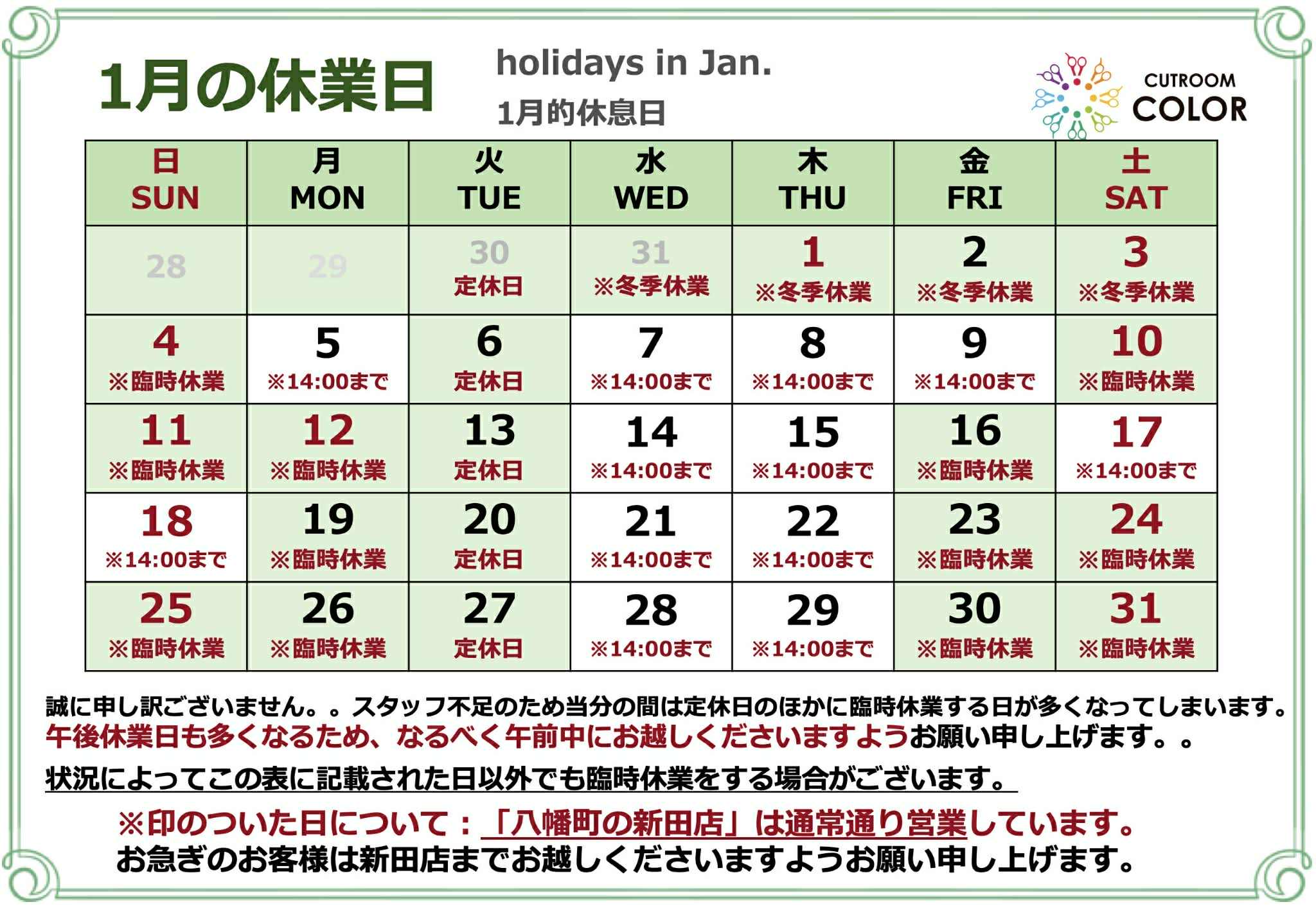 | 毎週火曜日他 ※人員不足のため急な休みになる場合があります。 |